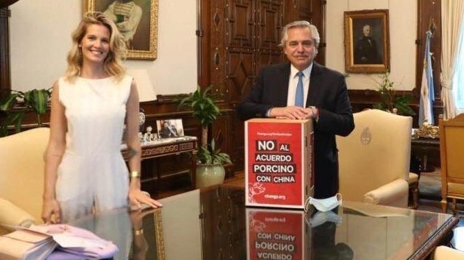 El Presidente abrió las puertas de la Casa Rosada para recibir a la actriz Liz Solari, quien le llevó medio millón de firmas reunidas por el movimiento vegano para oponerse a la firma de un acuerdo gubernamental con China, para instalar aquí 25 mega criaderos de cerdos para exportar a ese país.